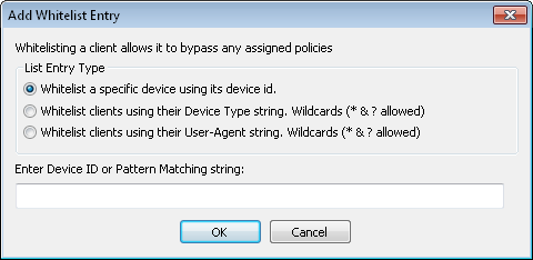 Use this option to exempt a specific Device Type, Device ID, or User Agent from provisioning, or policy restrictions.