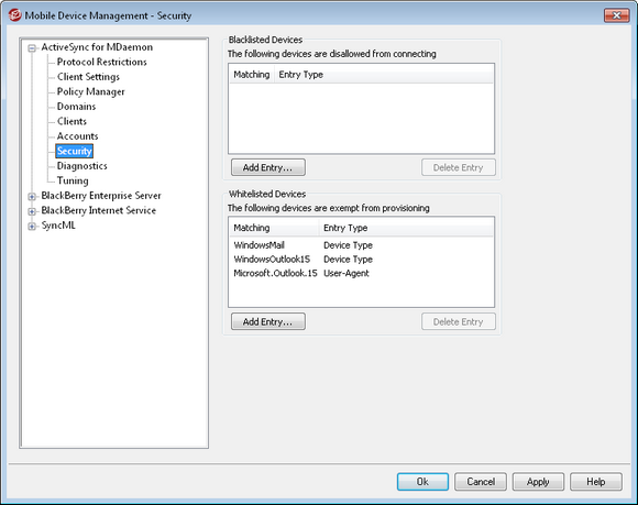 To add an entry to the list, click Add Entry, specify the device info, and click Ok. You can obtain the device info from the device itself or from the ActiveSync log files if the device has connected to MDaemon's ActiveSync server.