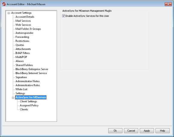 The ActiveSync for MDaemon screens in the Account Editor are used to enable or disable ActiveSync for the account, configure account-specific settings, assign a default policy, and manage the account's ActiveSync clients.