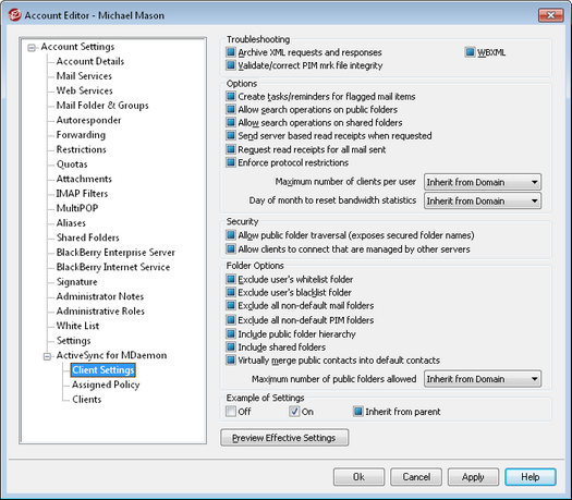 The options on this screen are used to control ActiveSync client settings for clients associated with this account. By default each of these options is configured to inherit its setting from the corresponding domain to which the account belongs. Changing any setting on this screen will override the domain setting for this account. Further, you can use the Settings option on the Clients screen if you wish to override these account-level settings for specific clients.