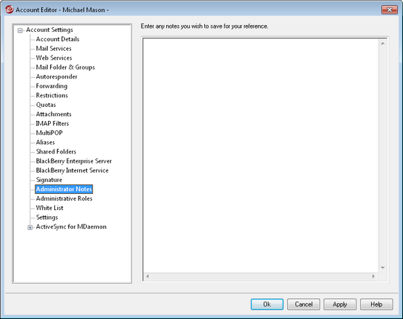 Use this screen for any notes or other information you wish to save for your own reference regarding this account. Unlike the Description field on the Account Details screen, Administrator Notes will not be synchronized to the public contacts or mapped to any field in Active Directory.