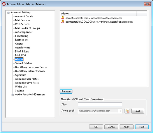 To add a new alias to the account, in the Alias box type the address that you wish to associate with the account and then click Add. The wildcards "?" and "*" are permitted, representing single characters and single words, respectively.