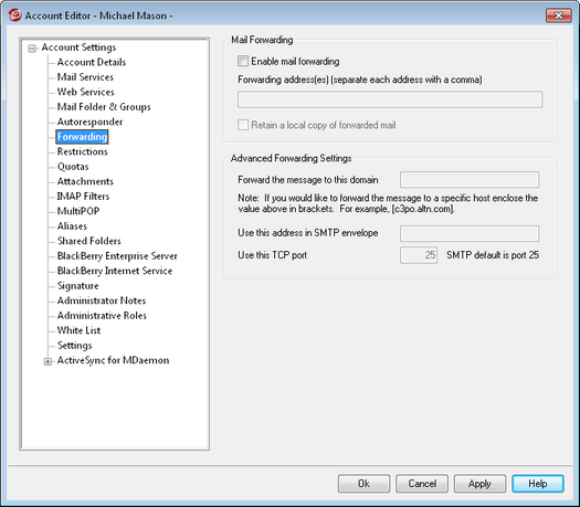 Check this box if you wish to forward this account's incoming messages to the address or addresses specified in the Forwarding addresses option below. MDaemon users with web access to WorldClient or Remote Administration can use the options provided to set the forwarding options for themselves rather than requiring an administrator to do so.