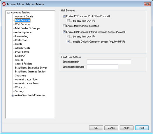 The options on this screen govern which mail services the account is allowed to use: POP, IMAP, MultiPOP, and Outlook Connector. Email access via WorldClient is controlled from the Web Services screen. It also contains options for specifying optional Smart Host Access credentials for the account.