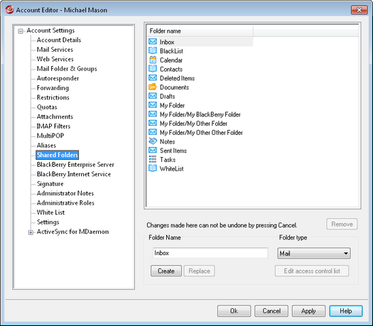 This top section displays all of the user’s IMAP Folders and can be used to share access to them with other MDaemon users or Groups. When the account is first created, this area will only have the Inbox listed until you use the Folder name and Create options (or the options on IMAP Filters) to add folders to it. Subfolders in this list will have the folder and subfolder names separated by a slash.