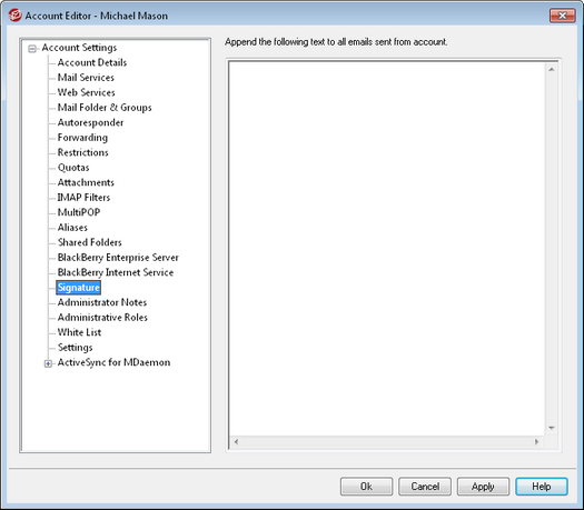 Use this screen to designate a signature that will be appended to the bottom of every email that the account sends. This signature is added in addition to any other signatures or footers added by other options, such as the signature option included in WorldClient and other mail clients, the Default and Domain signature options, and Mailing List footers. Default/Domain Signatures and Mailing List footers are always added below Account Signatures.