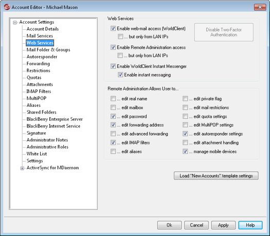 Check this box if you wish to grant the user permission to modify his or her account settings via Remote Administration. The user will only be able to edit those settings that you designate below.