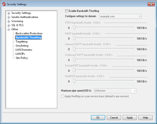 Click this checkbox if you want to throttle bandwidth on a per-service basis rather than the default per-session basis. When throttling on a per-service basis, the service's designated amount of bandwidth will be divided equally among all active sessions of the given service type. Thus, the total amount of bandwidth used, for example, by multiple IMAP clients connecting at the same time could never exceed the designated amount regardless of how many clients were connected. If throttling on a per-session basis, then no single IMAP session could exceed the designated limit but the total of multiple simultaneous sessions could.