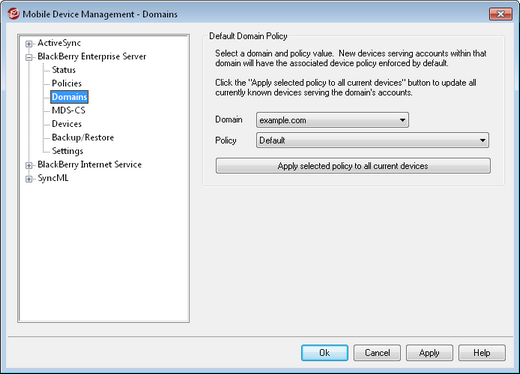 If you wish to apply a policy to all devices already activated on a domain, select a domain and policy from the drop-down lists and then click this button. The policy will be applied to all activated accounts on the domain—even to those accounts that have had a different policy assigned to them on the Account Editor's BlackBerry Enterprise Server screen.