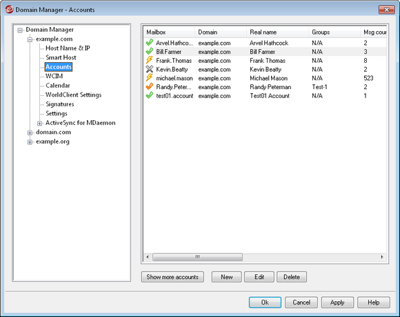 The Accounts page displays a list of all of this domain's MDaemon accounts. Each entry in the list contains Account Status Icons (see below), the mailbox, the "real name" of the account holder, any groups to which the account belongs, the message count, and the amount of disk space used (in MB). This list can be sorted in ascending and descending order by whichever column that you prefer. Click any column heading to sort the list in ascending order by that column. Click the column again to sort it in descending order.