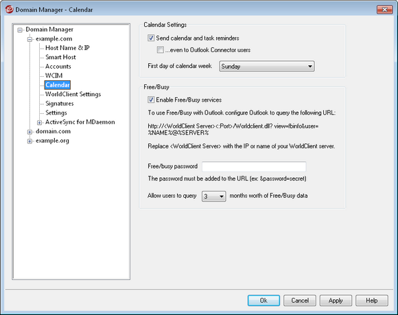 This screen controls MDaemon's Calendar features for this domain. The initial settings on this screen are determined by the Calendar screen located on the Web & IM Services dialog.