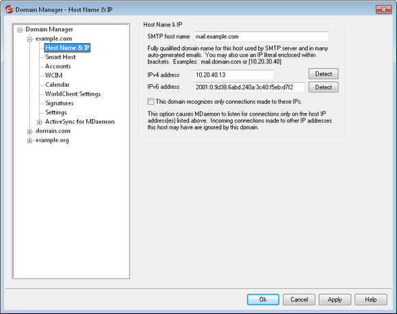 Enter the IPv4 and IPv6 addresses to associate with this domain. If an IP address is missing MDaemon will automatically try to detect a suitable address for use.