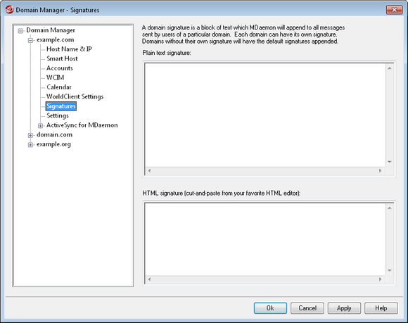 Use this screen to append a signature to all messages sent by this domain's users. If no signature is specified here then the Default Signature will be appended instead. Signatures are added to the bottom of messages, except for mailing list messages using a footer, in which case the footer is added below the signature. You can also use the Account Editor's Signature feature to add individual signatures for each Account. Account signatures are added just before Default or Domain Signatures.