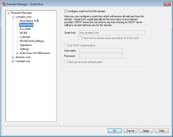 If you wish to route this domain's outbound mail through a specific Smart Host rather than using MDaemon's default Delivery options, enable this checkbox and specify the smart host below. All of the domain's outbound mail will be routed to the host.