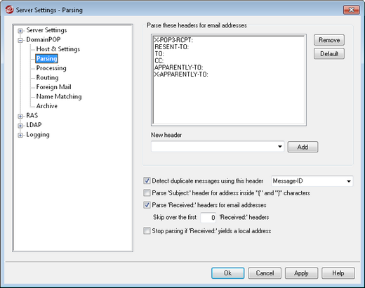 It is possible to store the recipient information ordinarily found only within the message’s envelope in the "Received" message headers. This makes it possible for parsers of the mail message to be able to glean the actual recipient address by merely inspecting the Received headers later. Click this checkbox if you wish to parse valid addresses from all of the "received" headers found within the mail message.