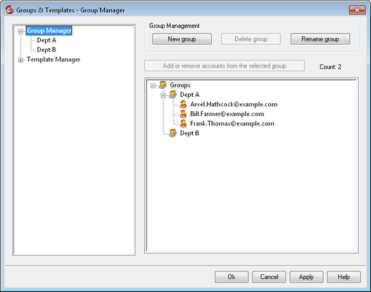 The Group Manager (Accounts » Groups & Templates... » Group Manager) is used to create account Groups and manage which accounts belong to them. Groups have a number of different uses and functions. For example, using the Group Properties screen you can assign an account template to a Group, allowing you to control a variety of account settings for group members. You can also control whether or not group members have access to WorldClient Instant Messenger and instant messaging. Further, the Content Filter supports groups, allowing you to create rule conditions based on whether or not a message sender or recipient is a member of a specific Group. Finally, for Shared Folders you can assign Access Control List rights to specific Groups, meaning all members of that Group will share those access rights.
