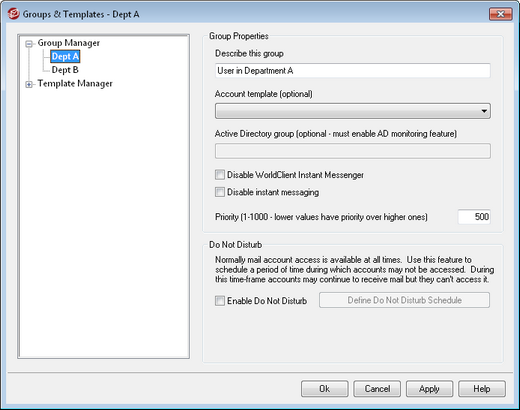 The Group Properties screen (Accounts » Groups & Templates... » [group name]) is used to configure the settings for each group you have created using the Group Manager. To open Group Properties from the Group Manager, double-click the group you wish to edit, or click the name of the group in the left pane. On this screen you can assign an Account Template to a group, allowing you to control a variety of account settings for group members. You can also link the group to an Active Directory group, control whether or not group members have access to WorldClient Instant Messenger (WCIM) and instant messaging, and set a priority level for the group. To control group membership, use the Group Manager and Mail Folder & Groups screen on the Account Editor.