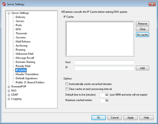 In order to speed message delivery and shorten mail processing time, MDaemon caches the IP addresses of all hosts with which it comes in contact. These IPs are stored and then the cache is checked each time MDaemon requires a DNS resolution on a host name. If the host name needing resolution is found in the IP cache then the DNS lookup is skipped, which can save a surprising amount of processing time. The settings in this window allow you to manipulate the parameters under which the cache will operate. You may also manually add and remove entries, set the maximum size of the cache, and designate how long entries will remain cached. The IP Cache can be reached from the "Setup » Server Settings » IP Cache" menu selection.