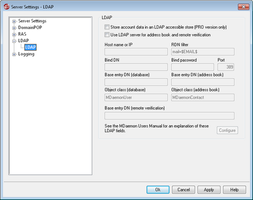 Click this check box if you want MDaemon to use your LDAP server as the MDaemon user database rather than ODBC or its local USERLIST.DAT system. You might want to use this method of maintaining your user information if you have multiple MDaemon servers at different locations but want them to share a single user database. Each MDaemon server would be configured to connect to the same LDAP server in order to share user information rather than storing it locally.