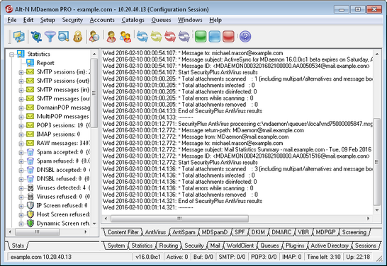 MDaemon's main graphical user interface (GUI) gives you important information regarding MDaemon's resources, statistics, active sessions, and queued mail waiting to be processed. It also contains options for easily activating/deactivating MDaemon's various servers. The GUI's tabbed panes keep you up to date on how the server and its incoming and outgoing connections are performing.