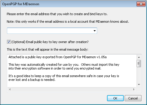 Enable this option if you want MDPGP to create a public/private key pair automatically for each MDaemon user. Rather than generate them all at once, however, MDPGP will create them over time, creating each user's key pair the next time a message is processed for that user. This option is disabled by default to conserve resources and avoid needlessly generating keys for accounts that may never use MDPGP.
