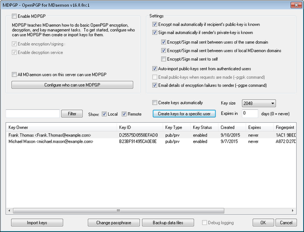 By default, when an authenticated user sends an email message with a public key in ASCII armored format attached, MDPGP will import that public key into the keyring. This is a simple way for a user to get a contact's public key into MDPGP, by emailing the public key to himself as an attachment. Disable this option if you do not wish to auto-import public keys.
