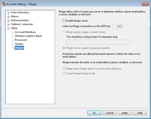 Located under Accounts » Account Settings, Minger is an email address verification protocol created by Alt-N Technologies. Originally based loosely on the Finger protocol, Minger is primarily intended to provide a simple and efficient mechanism for allowing others to query your server in order to verify whether or not an email address is valid. For efficiency Minger uses UDP rather than TCP, and for security it can require authentication—though it supports anonymous queries as well. The Minger dialog is used to enable/disable MDaemon's Minger server, designate the port that it will use (the default is 4069), and choose whether to require authentication via a shared secret system or to allow anonymous queries.