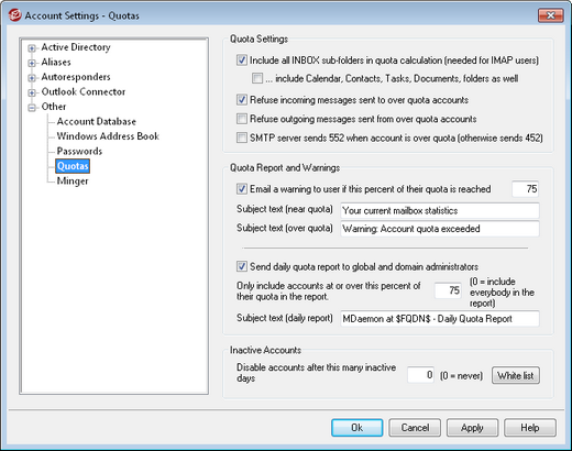 Check this box if you wish to refuse outgoing messages sent from any account that has reached its quota. An over-quota account will no longer be able to send mail until some of its stored messages have been deleted. This option is disabled by default.