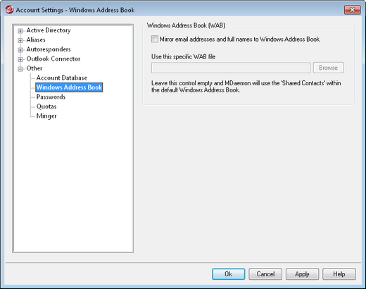 Specify the path to the *.wab file in which you wish to mirror your user information. If you leave this control empty then MDaemon will use the shared contacts store within the default Windows Address Book.