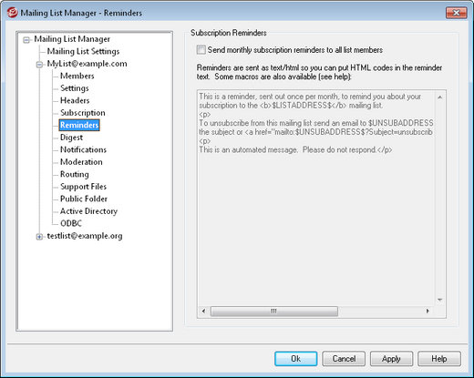 Enable this option if you wish to send the contents of the provided text box as a subscription reminder message to each list member on the first day of each month. The reminder message is sent as text/html so that you can use HTML code in the reminder text if you choose. The following macros are available for use within the reminder message: