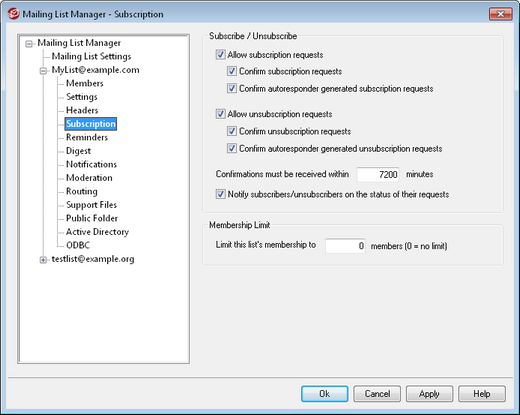 This option controls whether or not the list will allow subscription requests, either through specially formatted email messages or through autoresponders. For more information, see: Subscribing to Mailing Lists.