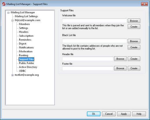 The contents of the files specified here will be used as the header and/or footer file for list messages.