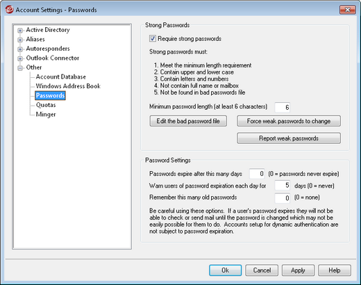 Use this option if you wish to set a maximum number of days that an account can be accessed before being required to change its password. The default value in this option is "0", which means that passwords never expire. But if you set it to, for example, 30 days then the user will have 30 days to change his or her password, starting from the last time the account was edited in the user interface or logged in to POP, IMAP, SMTP, or WorldClient. If a user's password is changed then that will reset the timer. If a user's password expires then he or she will not be able to access POP, IMAP, SMTP, WorldClient, or Remote Administration. The user can, however, still connect to WorldClient or Remote Administration where he or she will then be required to change the password before proceeding. Email clients such as Outlook, Thunderbird, and the like cannot be used to change the password. Further, many clients will not even show a helpful error message to users, therefore they may need administrator assistance to figure out why their login is failing.