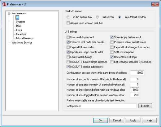 Notepad.exe is the general text editor that the MDaemon UI will launch by default when needed. If you prefer to use a different text editor, enter its file path or executable name here.