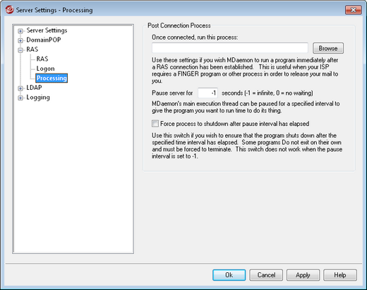 Sometimes the program you need to run may not exit once it has run its course; some programs require user intervention in order to close them down. This is not acceptable when the software must run unattended. If this switch is selected MDaemon will force the process thread to terminate once the number of seconds specified in Pause Server For XX Seconds has elapsed. This function does not work when the server is configured to wait indefinitely for the process to return.