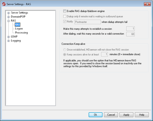 Click the "Setup » Server Settings » RAS" menu selection to configure your RAS Dialup settings. This dialog will only be available if you have Remote Access Services installed on your system. It is used by MDaemon when you need to dial up your ISP just prior to a Remote Mail processing event.