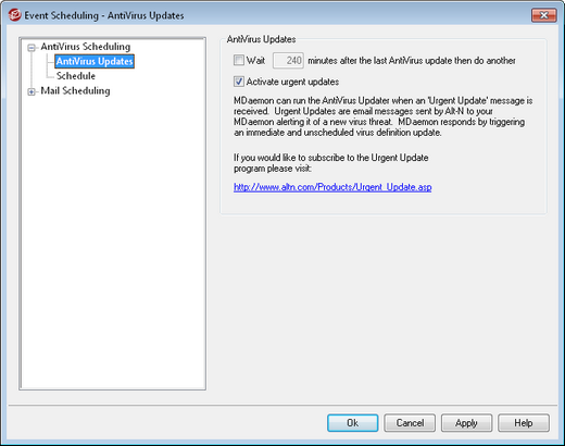 Click this checkbox to activate the urgent updates feature. With this feature enabled, SecurityPlus for MDaemon will immediately connect to the update location and download the high-priority update whenever MDaemon receives an "Urgent Update" message. To receive these messages you must add your domain to the Urgent Updates system at altn.com.