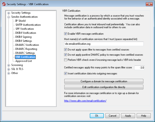 The VBR Certification dialog is located at: Security » Security Settings » Sender Authentication » VBR Certification.