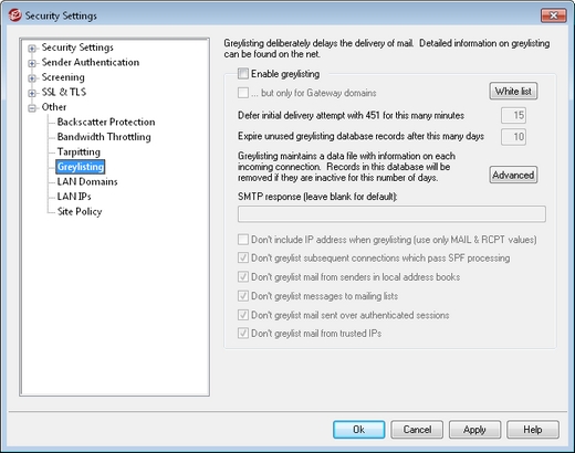 Greylisting is located under the Security dialog at: Security » Security Settings » Other » Greylisting. Greylisting is a spam-fighting technique that exploits the fact that SMTP servers retry delivery of any message that receives a temporary (i.e. "try again later") error code. Using this technique, when a message arrives from a non-white listed or otherwise previously unknown sender, its sender, recipient, and sending server's IP address will be logged and then the message will be refused by Greylisting during the SMTP session with a temporary error code. Furthermore, for a designated period of time (say, 15 minutes) any future delivery attempts will also be temporarily refused. Because "spammers" do not typically make further delivery attempts when a message is refused, greylisting can significantly help to reduce the amount of spam your users receive. But, even if the spammers should attempt to retry delivery at a later time, it is possible that by that time the spammers will have been identified and other spam-fighting options (such as DNS Black Lists) will successfully block them. It's important to note, however, that this technique can deliberately delay "good" email along with the "bad". But, the legitimate messages should still be delivered sometime later after the greylisting period has expired. It is also important to note that you have no way of knowing how long the sending servers will wait before making further delivery attempts. It is possible that purposely refusing a message with a temporary error code could cause it to be delayed by as little as just a few minutes or by as much as an entire day.