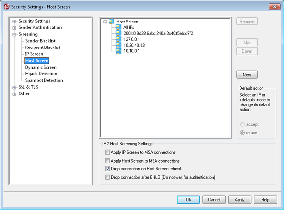 The Host Screen is located at: Security » Security Settings » Screening. It is used to define which remote hosts will be allowed to connect to your local IP addresses. You may specify a list of hosts and configure the server to allow only connections from those hosts, or you can configure it to refuse connections from the listed hosts. Host screening compares the EHLO and PTR values determined during the SMTP session with the values specified here.