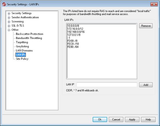 Similar to LAN Domains, this screen is used to list IP addresses that reside on your LAN (local area network). These IP addresses therefore do not require RAS or an Internet connection to reach them, and they are treated as local traffic for the purposes of bandwidth throttling. Further, there are various other security and spam prevention restrictions that they may be exempt from since they are local addresses.