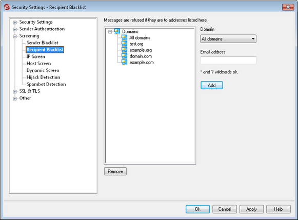 The Recipient Blacklist is located at: Security » Security Settings » Screening. This list contains email addresses that are not allowed to receive mail through your server. If a message arrives for an address on this list, it will be refused. Addresses may be blacklisted on a per domain basis or globally (applied to all MDaemon domains). The Recipient Blacklist operates on SMTP envelope RCPT data only (not message headers).