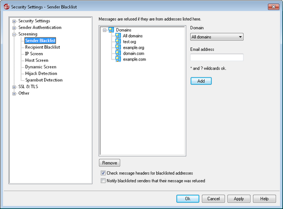 The Sender Blacklist is located at: Security » Security Settings » Screening. This list contains addresses that are not allowed to send mail traffic through your server. If a message arrives from an address on this list, it will be refused during the SMTP session. This is useful for controlling problem users. Addresses may be blacklisted on a per domain basis or globally (applied to all MDaemon domains).