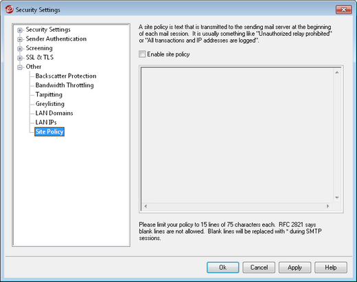 Use this dialog to specify a Site Policy statement for your server. The text is stored in the policy.dat file located in MDaemon's \app\ subfolder and is transmitted to sending servers at the beginning of every SMTP mail session. An example of a common site policy is, "This server does not relay" or "Unauthorized use prohibited." You do not need to prepend each line with "220" or "220-". MDaemon handles each line accordingly, either with or without these prepended codes.