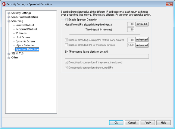 Spambot Detection tracks the IP addresses that every SMTP MAIL (return-path) value uses over a given period of time. If the same return-path is used by an inordinate number of different IP addresses in a short time, this could indicate a spambot network. When a spambot is detected, the current connection is immediately dropped and the return-path value is optionally blacklisted for a length of time you specify You can also optionally blacklist all the known spambot IP addresses for a designated period.