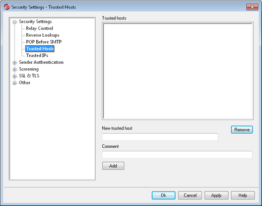 On various dialogs and security features throughout MDaemon you will see options that allow you to choose whether or not "Trusted Hosts" or "Trusted Domains" will be exceptions to or exempt from those options. The hosts you list on this screen are the ones to which those options refer.