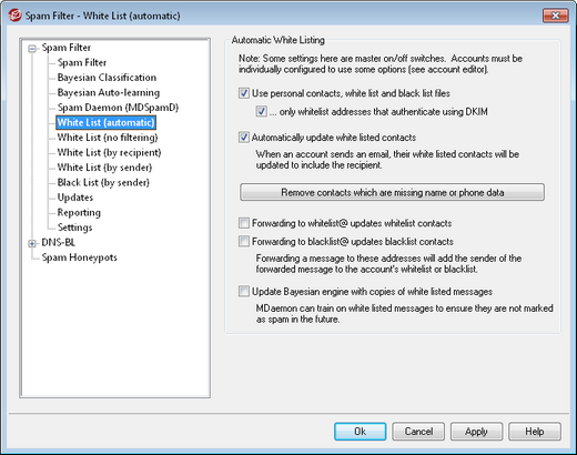 Click this option to allow each user's personal contacts, white list and black list files to be used as Spam Filter white and black lists. For each incoming message, MDaemon will search the recipient account's contacts, white list, and black list for the sender of the message. If the sender is found then the message will be white or black listed automatically. If you do not wish to apply automatic white and black listing to every MDaemon user then you can disable it for individual users by clearing the Spam Filter uses personal contacts, white list, and black list files option on the White List screen of the Account Editor.