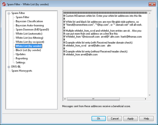 This white list is similar to White List (by recipient), except that spam score reduction is based on who the message is from rather than based on the recipient. Messages from these senders will have their Spam Filter score reduced by the amount specified on the Spam Filter Settings screen. Therefore including an address on this white list does not automatically guarantee that a message to that address will not be considered spam. For example, if you have the spam score threshold set to 5.0 and the white list value set to 100, and then a particularly excessive spam message arrives that gets a spam score of 105.0 or higher before the white list value is subtracted, then the final spam score of the message will be at least 5.0, thus denoting it as spam. This is highly unlikely, however, because spam rarely has a value that high unless it contains some other exceptionally high-scoring element, such as a blacklisted address.