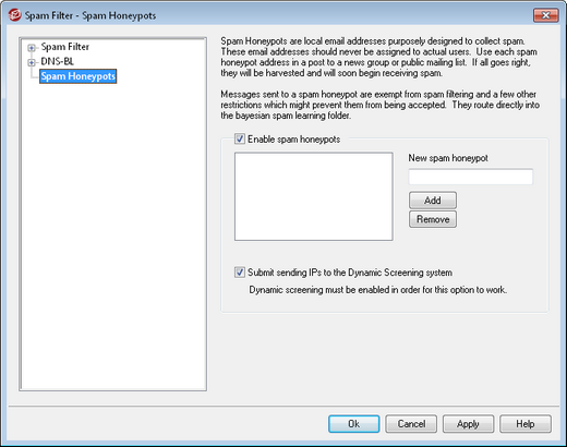 Spam Honeypots (located at Security » Spam Filter » Spam Honeypots) is for designating local email addresses purposely designed to collect spam. These spam honeypots are not valid MDaemon accounts or address aliases and should never be used for sending or receiving legitimate email. But, by posting a honeypot address to a news group, public mailing list, or other source from which spammers often farm addresses, you should begin to see incoming messages addressed to the spam honeypots — you could also pull addresses from other spam that you have received addressed to other invalid local addresses. Because honeypots will never receive legitimate email, all incoming messages addressed to them will always be routed directly to your Bayesian spam trap folder for processing. Further, the IP addresses of the sending servers can optionally be added to the Dynamic Screening system, banning future connections from those addresses for a designated period of time. All of this helps increase the probability of identifying and blocking spam in the future.