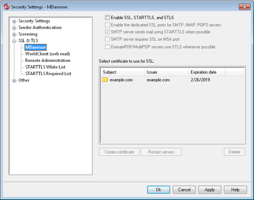 MDaemon does not support different certificates for multiple domains. All mail domains must share a single certificate. If you have more than one domain then enter those domain names under the option, Alternative host names (separate multiple entries with a comma) outlined below. |
